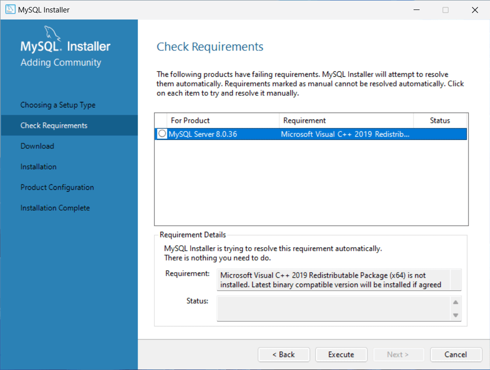 在 Windows 平台上,缺少 Microsoft C 和 C++(MSVS)运行时库(MySQL Server 需要依赖此库)导致无法运行 MySQL Server,因此提示要求安装此依赖