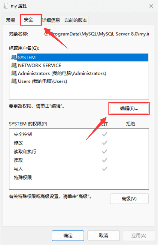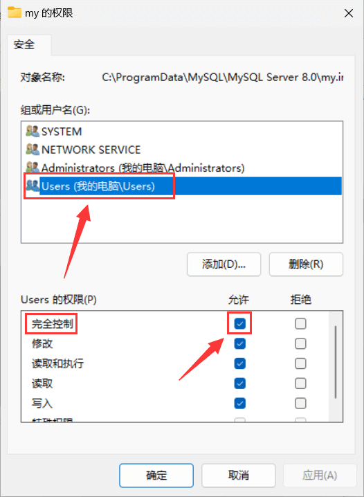 在上方选择 "安全" 选项,并点击其中的 "编辑..." 按钮;在权限页面选择 "Users",并勾选下方权限中 "完全控制" 右侧的 "允许" 选项,应用并确定