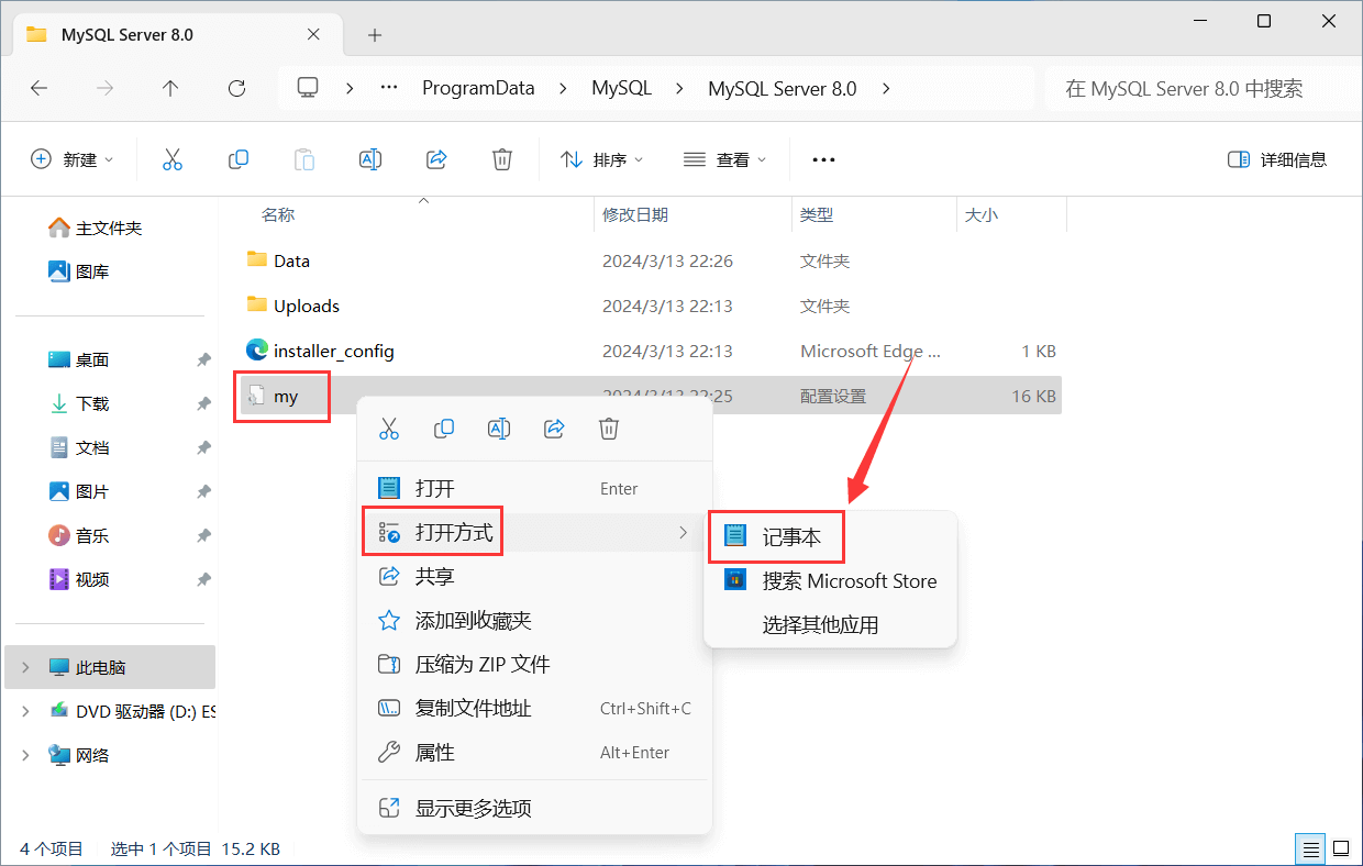 再次右键单击 "my.ini" 文件,选择打开方式用 "记事本" 打开