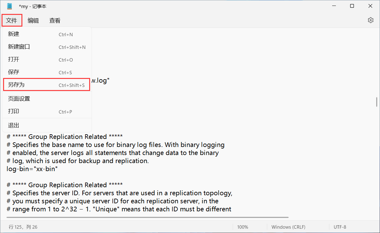 修改完成后,在记事本左上方点击 "文件" 选项,并选择 "另存为"