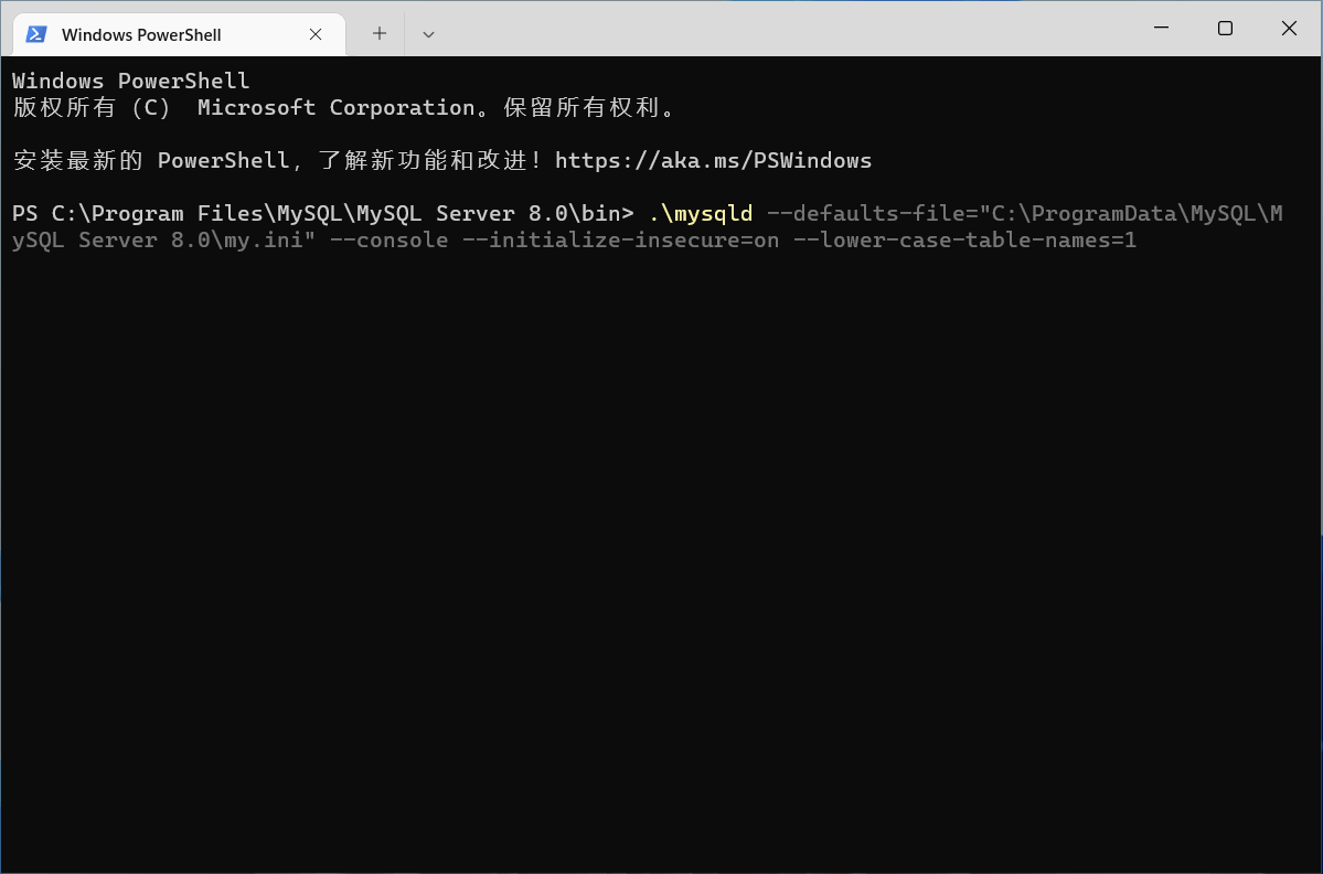 > .\mysqld --defaults-file="C:\ProgramData\MySQL\MySQL Server 8.0\my.ini" --console --initialize-insecure=on --lower-case-table-names=1