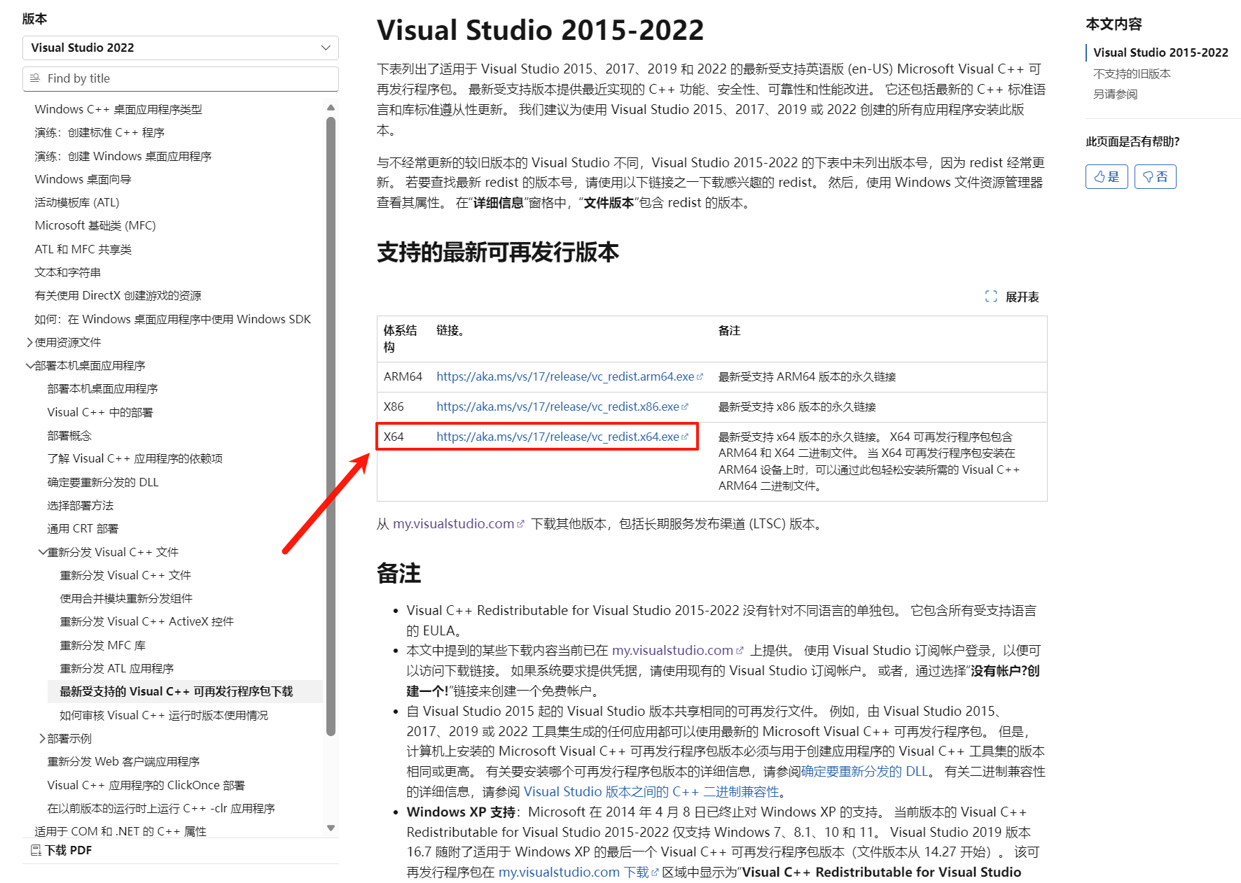 官网,在 "支持的最新可再发行版本" 下选择对应版本(X64)并下载安装即可