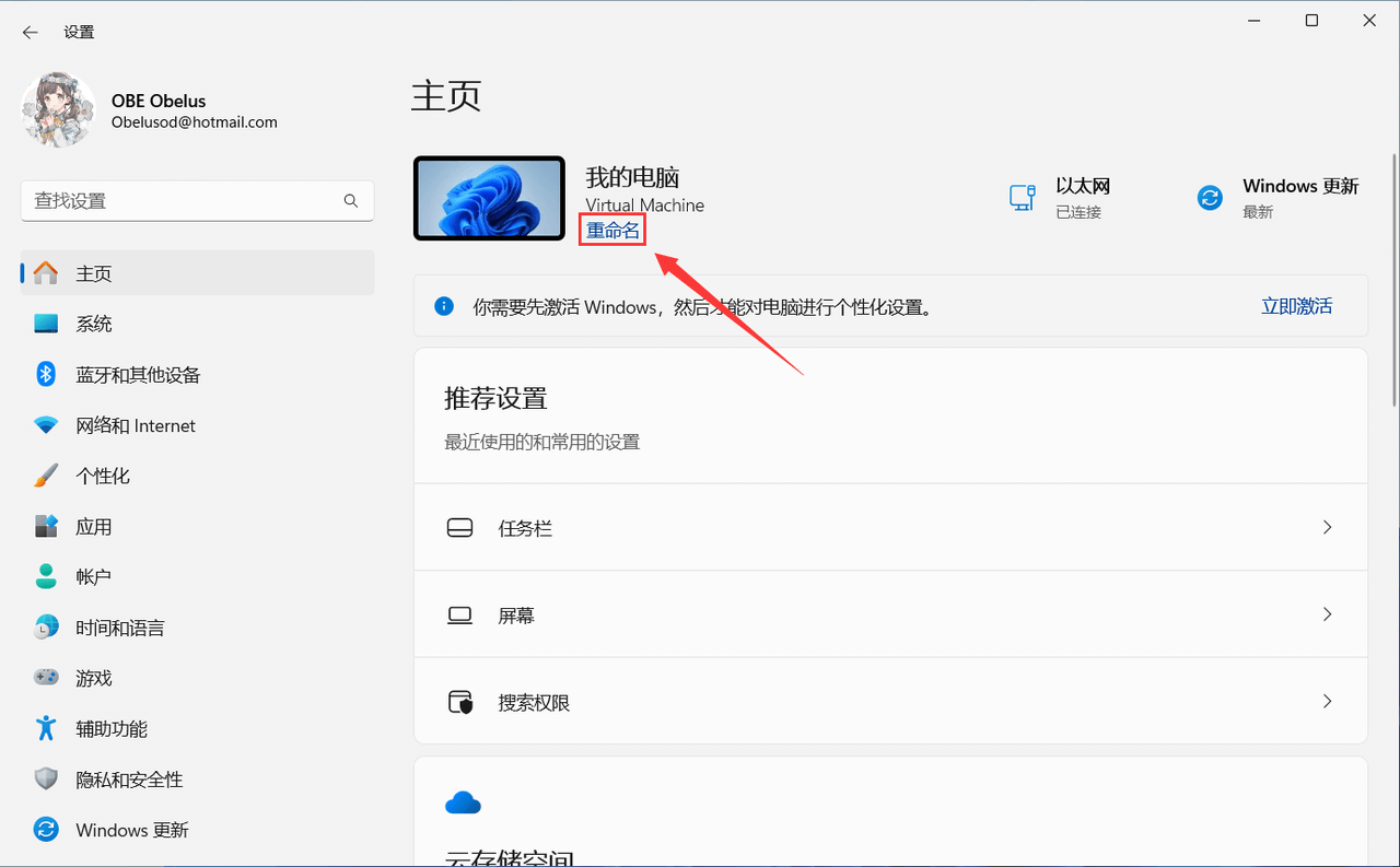 打开系统设置,在 "主页" 页面上方点击重命名,将设备名称改为 ASCII 字符(如英文、数字),并重启电脑