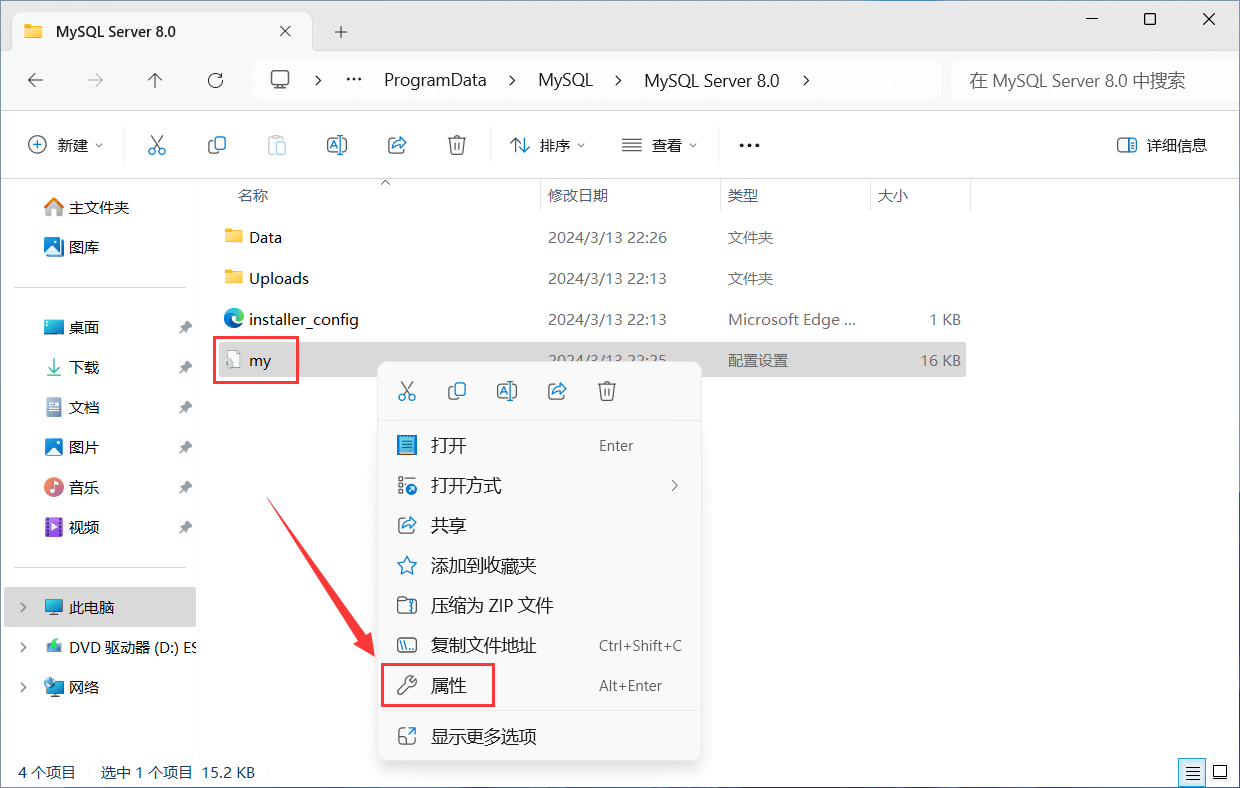 右键单击 "my.ini" 文件,选择 "属性" 选项,打开文件属性设置